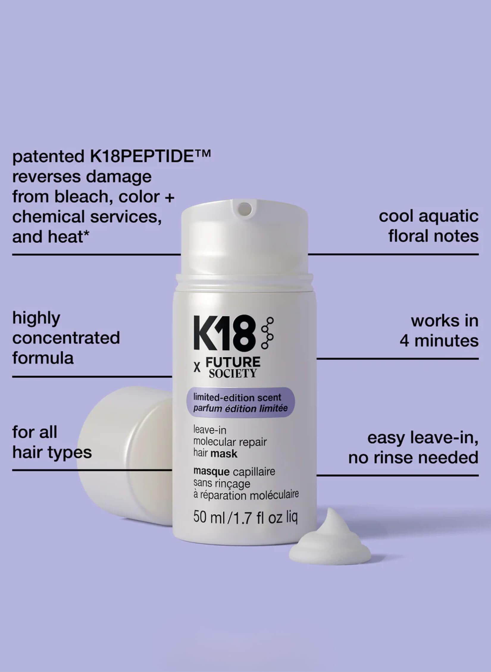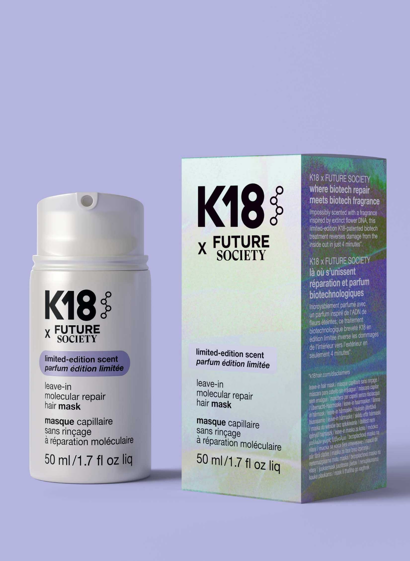 Φυσικά, στη σύνθεση της K18 x Future Society Floating Forest Leave-In Molecular Repair Hair Mask βρίσκεται το πατενταρισμένο K18PEPTIDE™, σχεδιασμένο για να επιδιορθώνει τη φθορά που προκαλείται από οποιαδήποτε βαφή καθώς και τη θερμότητα, αποκαθιστώντας τη δύναμη, την απαλότητα, και την ελαστικότητα όλων των τύπων μαλλιών σε μόλις 4 λεπτά.
