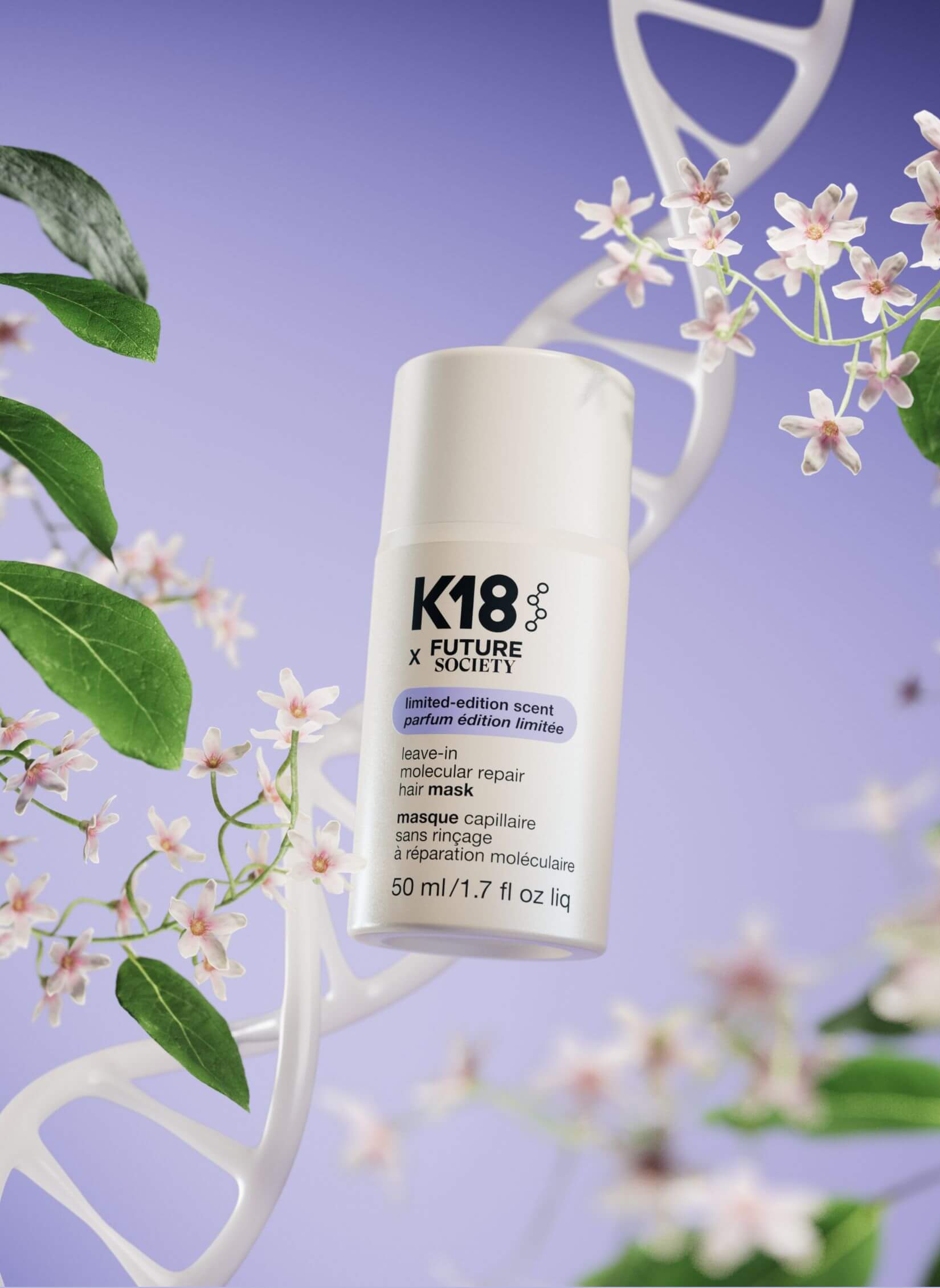 Πρόκειται για τη γνωστή και αποτελεσματική φόρμουλα της K18 Molecular Repair Hair Mask, εμπλουτισμένη με ένα δροσερό άρωμα λουλουδιών που δυστυχώς έχουν πλέον εκλείψει. Χάρη στη βιοτεχνολογία, η Future Sοciety κατάφερε να αναβιώσει το άρωμα ενός φυτού που μέχρι τα μέσα της δεκαετίας του 1990 βρισκόταν αποκλειστικά στο τροπικό δάσος του Βόρνεο. Έτσι, η Future Society δημιούργησε το Floating Forest και σε συνεργασία με την Κ18, γνωστή επίσης για τη στενή της σχέση της με τη βιοτεχνολογία, πρόσθεσαν το μοναδικό αυτό άρωμα στην Κ18 Molecular Repair Hair Mask.